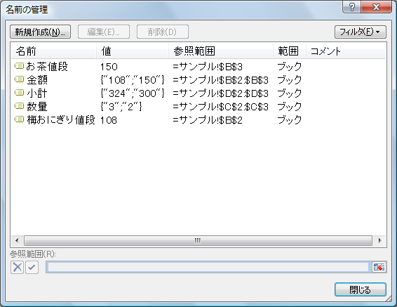 名前には、ブック全体で有効な名前と各シートで有効な名前があります