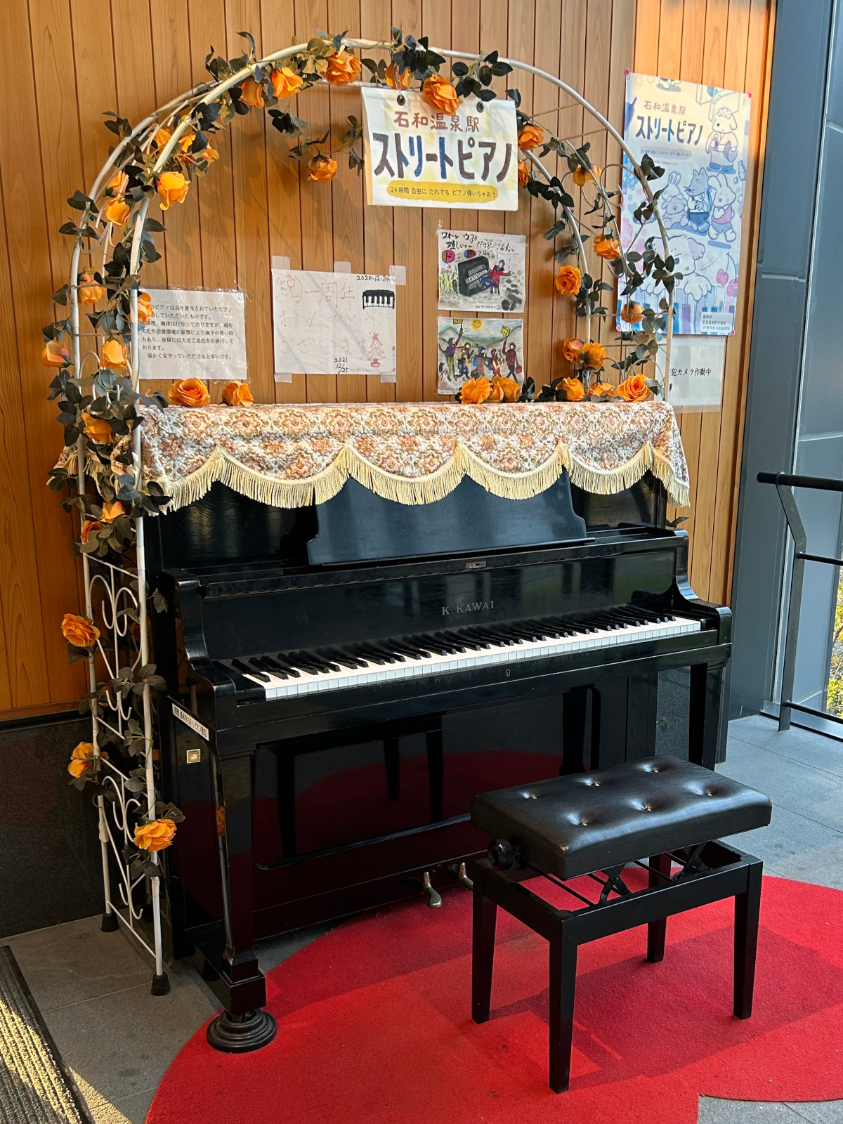 ピアノは河合製で、音楽教室で使っていたピアノが寄贈されたようです。2019年12月に設置されたようですね。もうすぐで5年です。