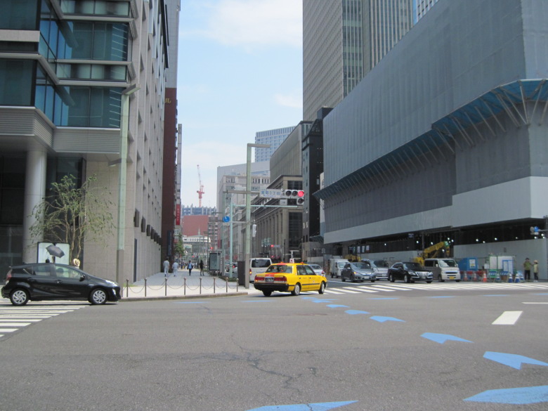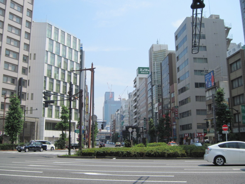 This is the intersection of Sudacho. Here, you turn right from Yasukuni Street on the right side of the picture to Route 17 (Chuo Street) at the back of the screen. The streets don’t intersect at right angles, so it’s a big, snarky turn.