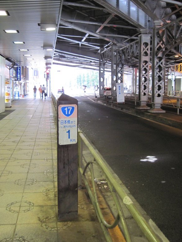 There was a 1km kilometer post under the JR guard. Since Nihonbashi is the 10km point of the marathon, this is about the 9km point.
