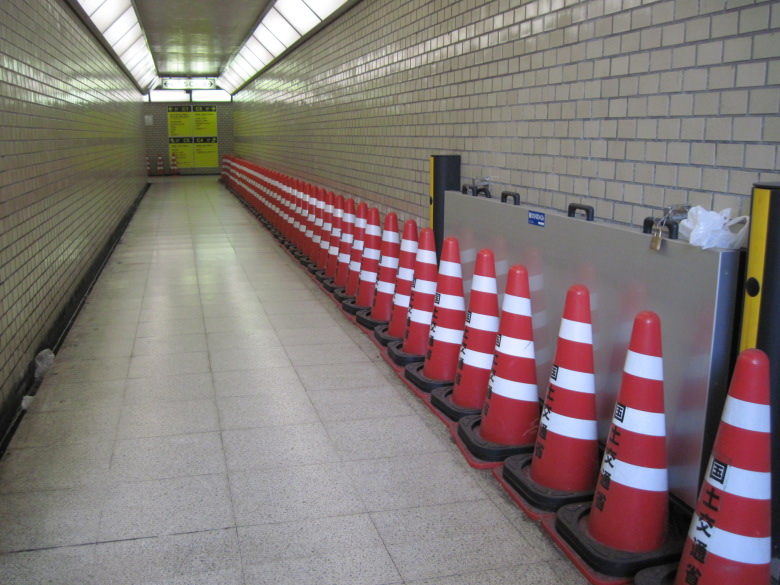 This is the interior of the underpass. Colored cones were lined up in a well-behaved manner.