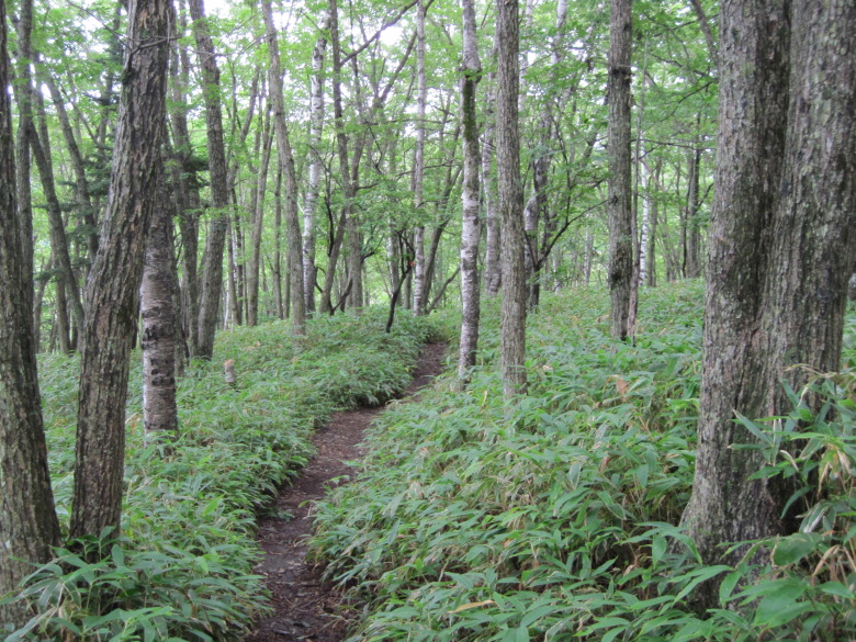 I guess it’s kuma-zasa. At the beginning, the trail is gentle, but it continues to climb through a birch forest.