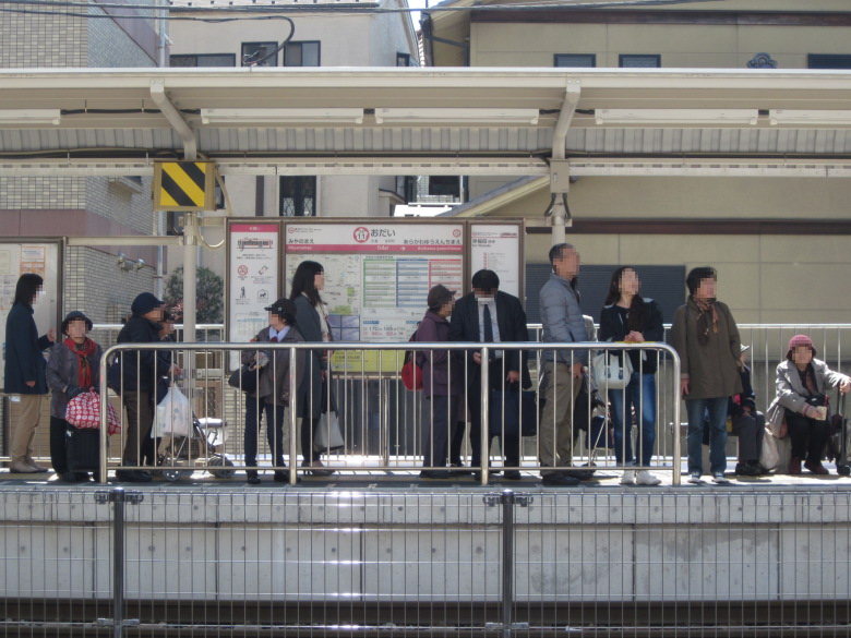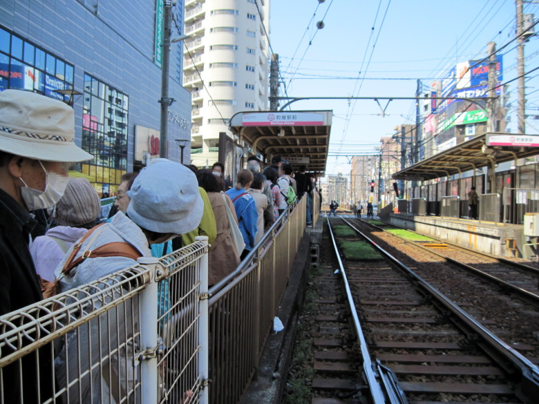 While I was thinking that I should have taken the tram from Oji, or that it would be faster to walk one station east and take the tram from Arakawa 7-chome, the tram bound for Arakawa Shako-mae, which doesn’t go to Oji, arrived, and I boarded the tram with many people in the background.