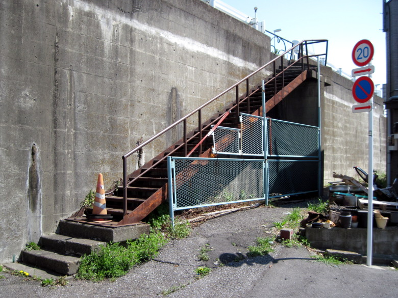 We wanted to walk on the embankment for a better view, but all the stairs were blocked off. This staircase also had colored cones at the bottom and a guard at the top. I wondered if this was to prevent traffic accidents.