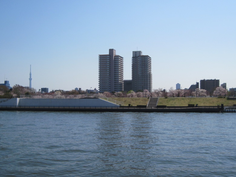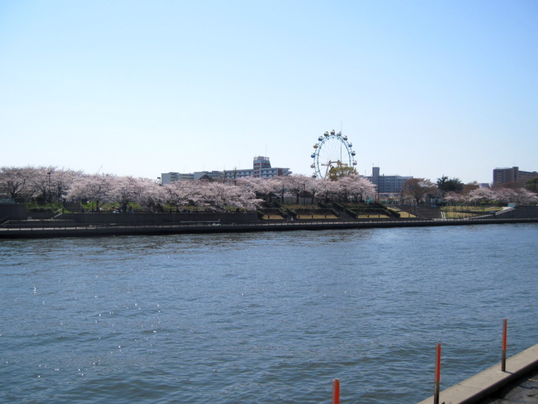 I could see Arakawa Park on the other side of the Sumida River. There are many cherry blossom trees. I would like to see what the view would be like from that Ferris wheel.