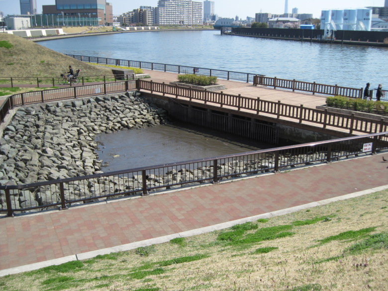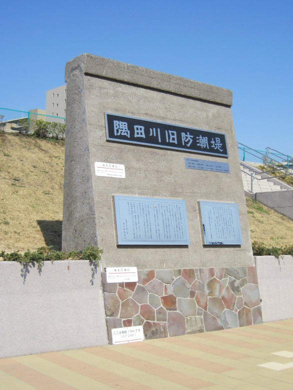 As a past tide level, I found that it was 3.89 meters above sea level during the Ise Bay typhoon. However, this value is the tide level in Aichi Prefecture, not the one observed in Sumida River. The highest tide level in Sumida River seems to be 2.42m above sea level (typhoon No. 20 in 1979), which is indicated on the border of concrete and stone wall. There is quite a bit of leeway, which is a little reassuring.