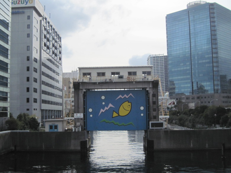 The Furukawa sluice gate can be seen from the Toshiba Ura Bridge. I wanted to see for myself the picture of this surprised and troubled looking fish. Thrilled!