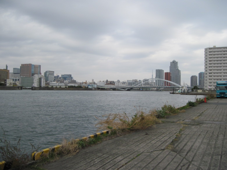 築地大橋は、そのうちに渡る機会もあると思いますし、今日は環状三号線を歩ききることが目的なので、隅田川の下流に足を伸ばしました。行政的にはここは既に東京湾です。先ほどの築地大橋と東京スカイツリーが重なって見えます。
