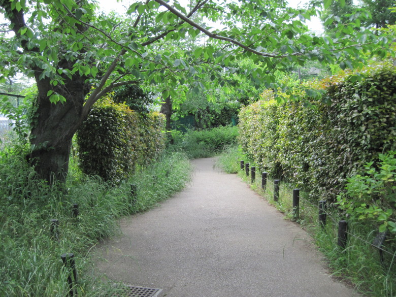 神社の右を通り、更に200m進んだところから烏山川緑道に入りました。