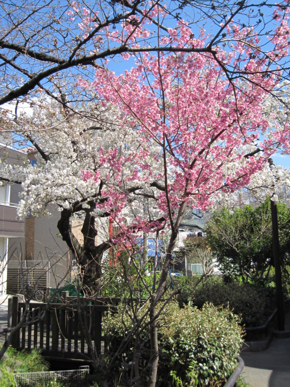 桜の開花宣言が3/21に出されました。ソメイヨシノはまだ見ごろではありませんでしたが、緑道沿いには花々が咲き乱れていました。