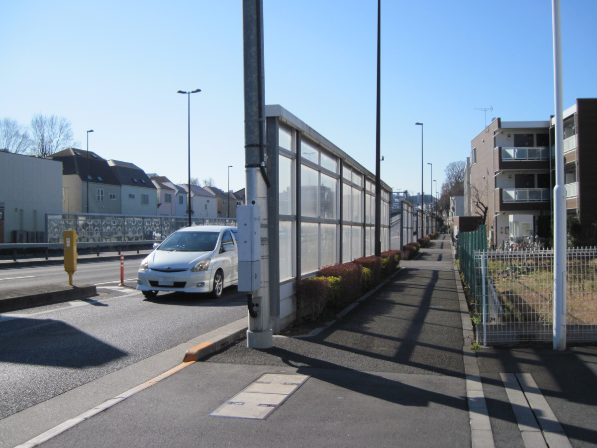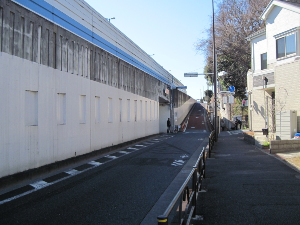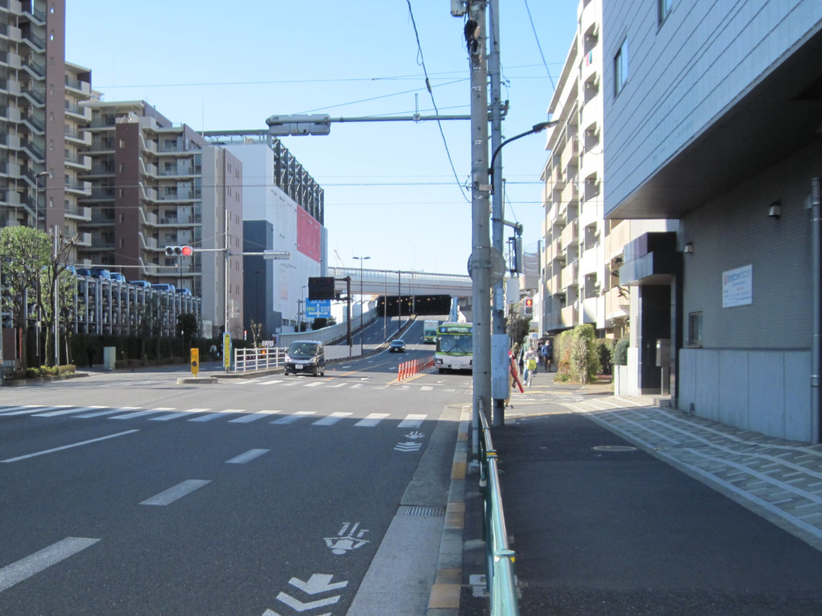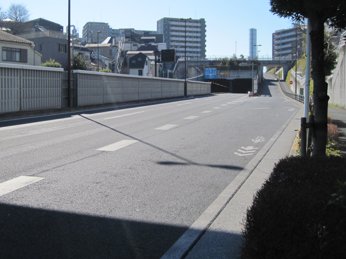 800mほど歩いたところで、車道がトンネルに入っていくのが見えました。地下に潜るのかと思ったら、すぐに出てきました。どうやら、首都高速五号線の下をくぐるだけのトンネルのようです。首都高からの落下物を避けるためでしょうか?