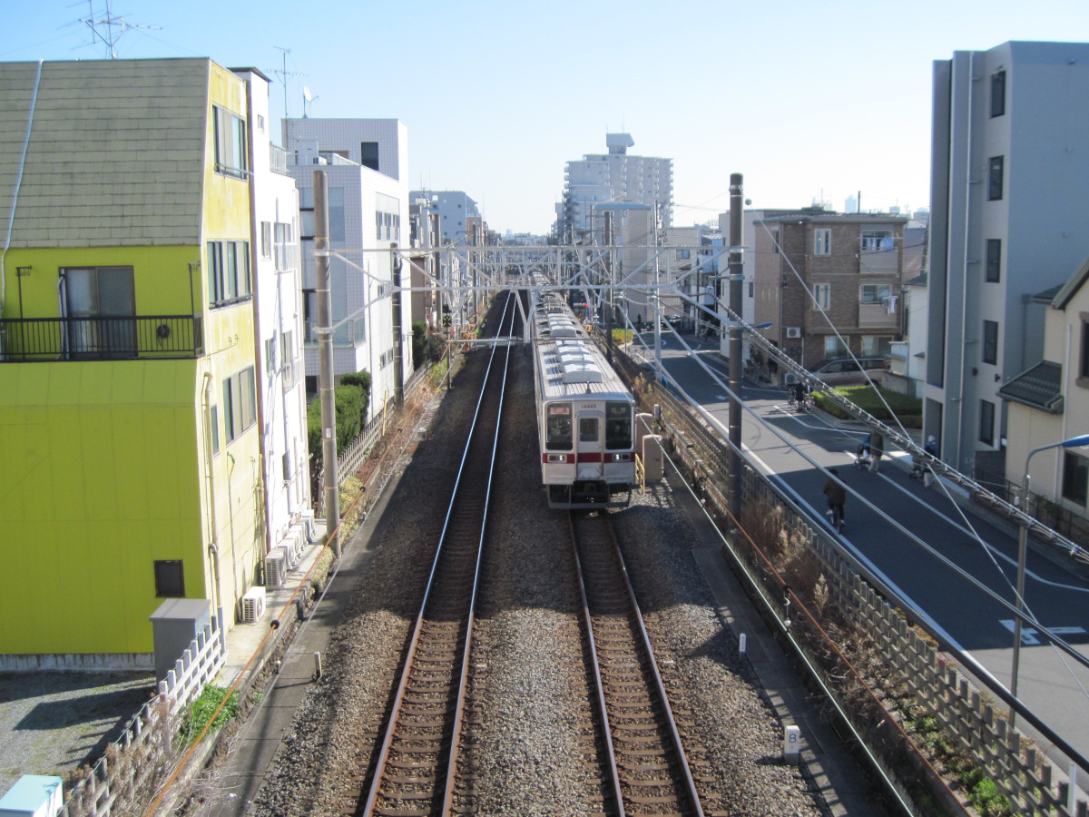 歩道橋は東武東上線の上を越えます。たまたま通過する電車を撮ることができました。