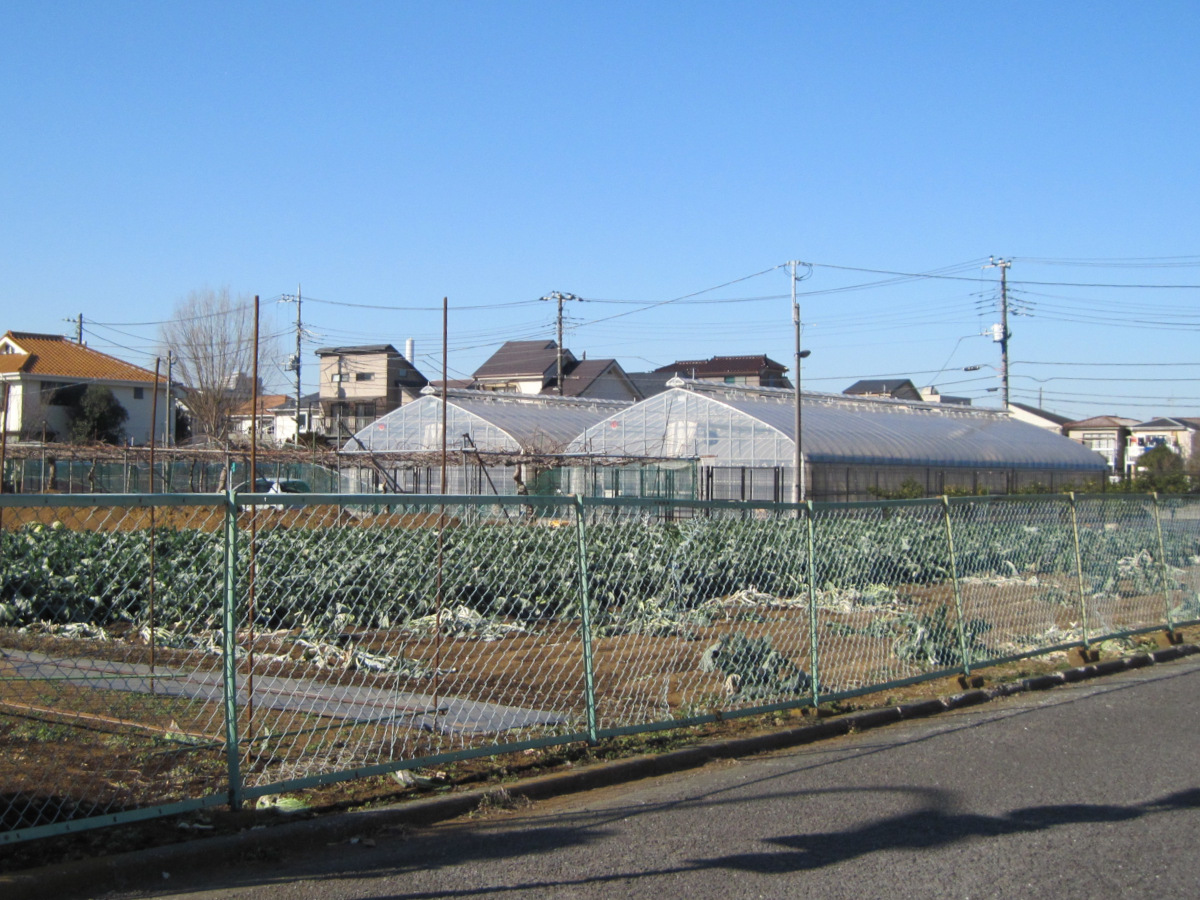 広い畑で作っているのは白菜でしょうか。