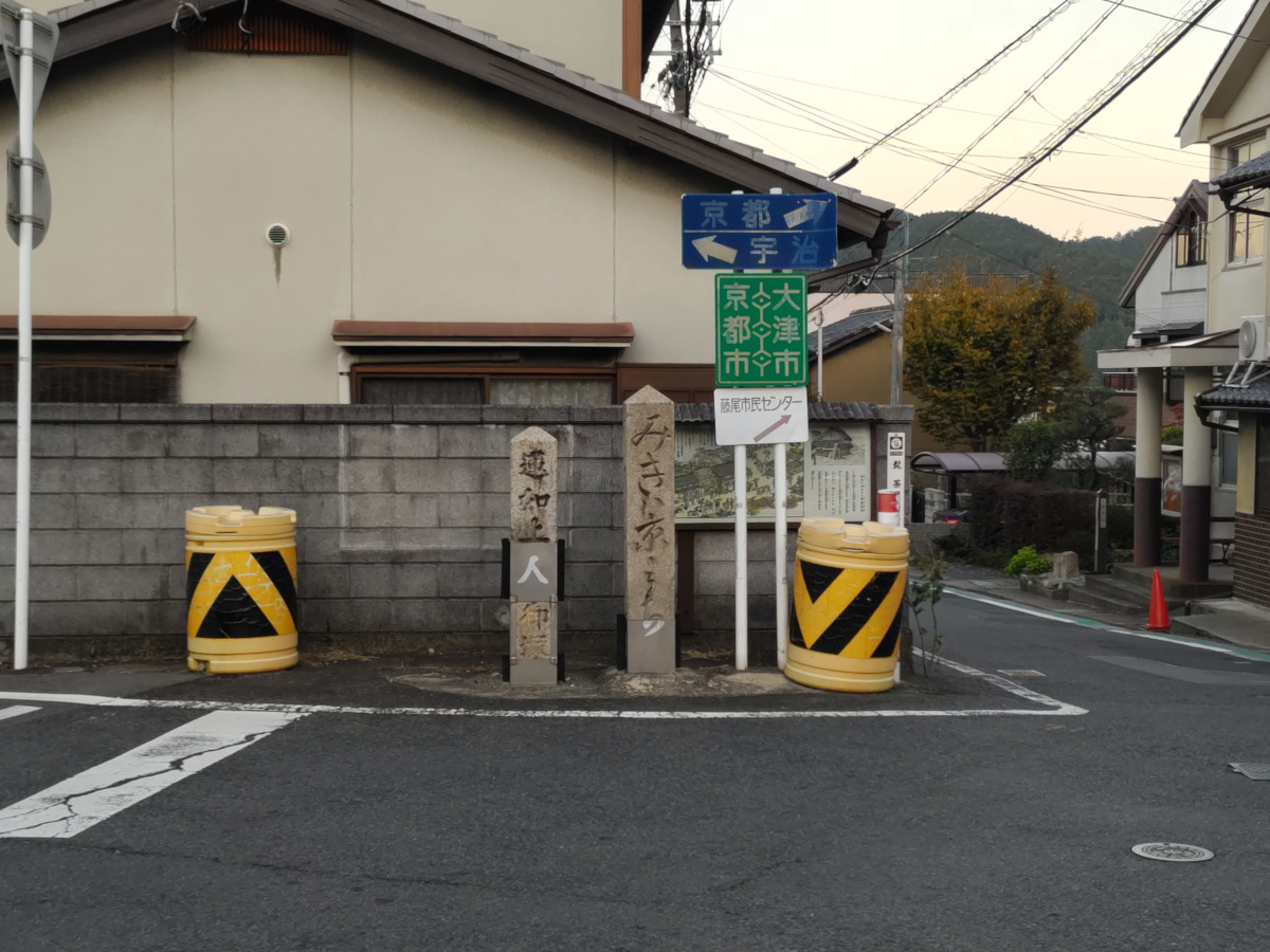 9年半ぶりにに再訪の時が訪れました。山科追分です。道標があります。「みぎ京みち」と書いてあるようです。前回、2014年5月28日に、ここに来た時には事故で破損していて、撤去されていました。それが再建されていて、感無量です。