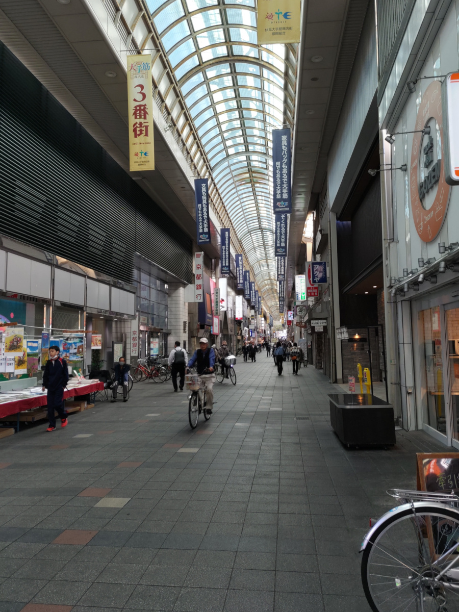 伏見桃山駅近くの大手筋通り商店街です。今回の街道歩きでは、このようなアーケードのある大きな商店街を何度も横切ります。うちの近くにもこんな商店街があればいいのに。
