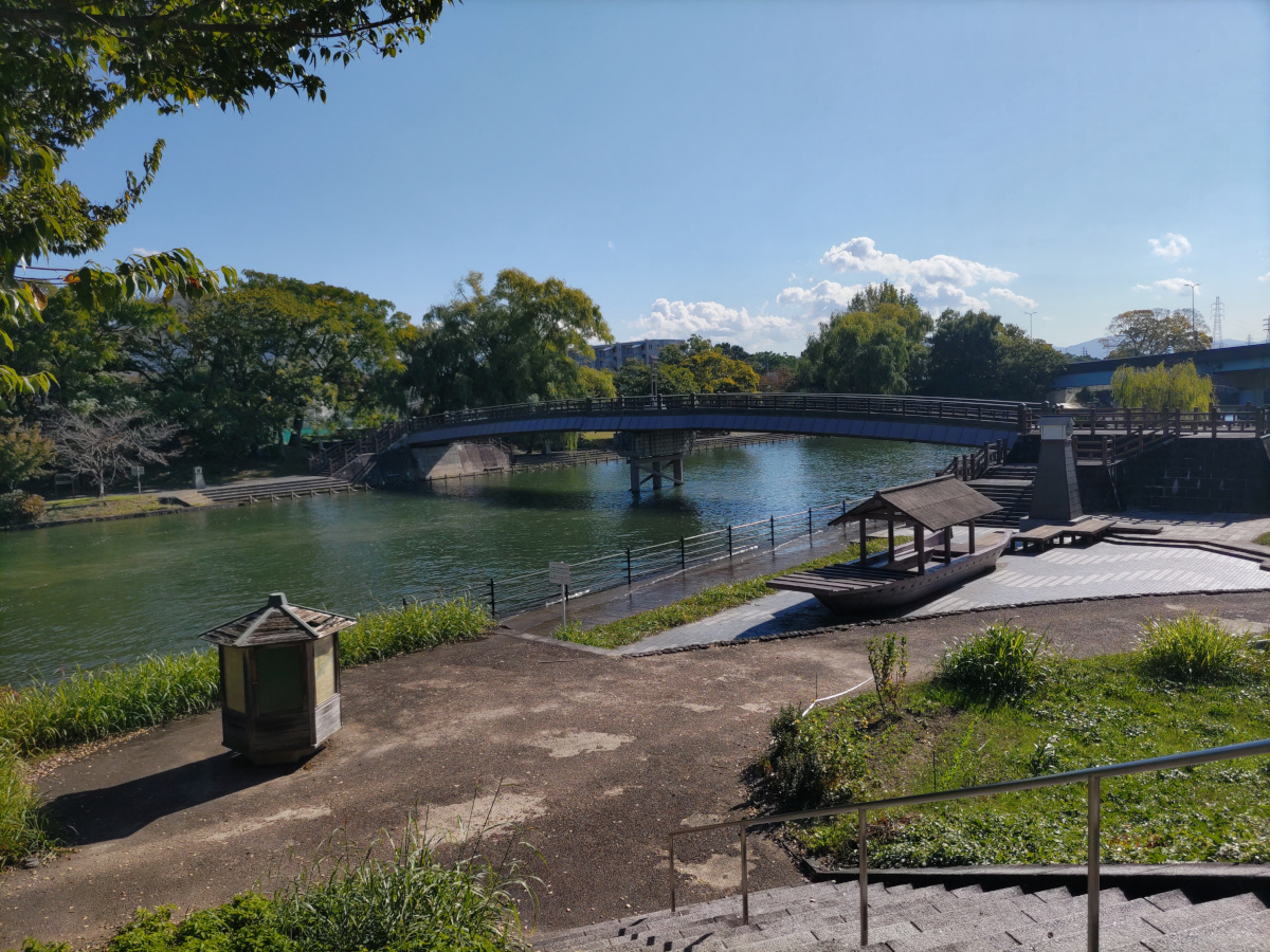 伏見みなと公園広場は、伏見みなと橋と十石舟の模型がある雰囲気のいい場所です。昔は船の荷の積み下ろしで栄えた場所なのかもしれませんが、今日は誰もいません。貸し切りです。