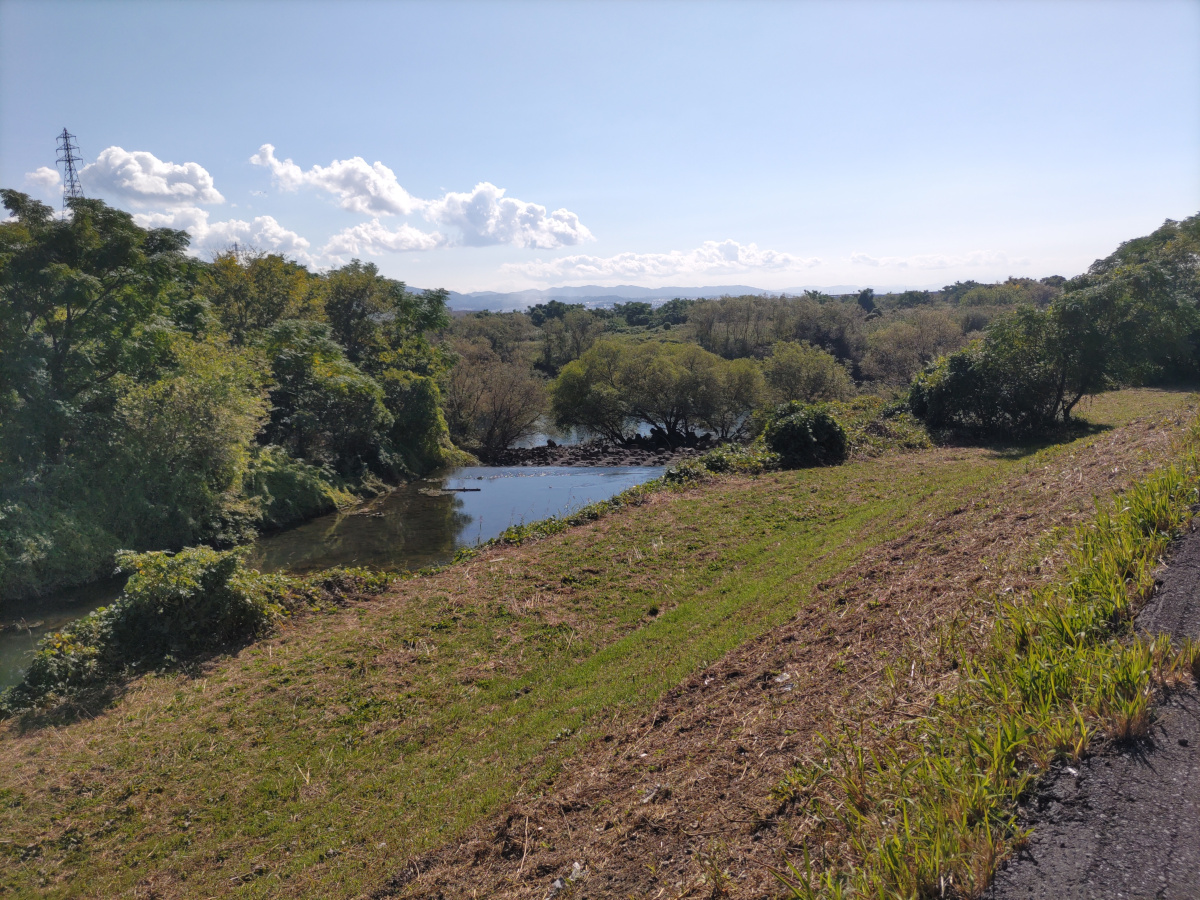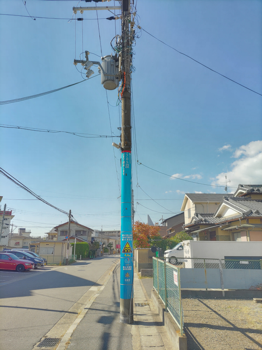 桂川が浸水すると、水が4.4mの高さに達するそうです。向かって左側の宇治川沿いを歩いてきましたが、右側から桂川が近付いてきています。
