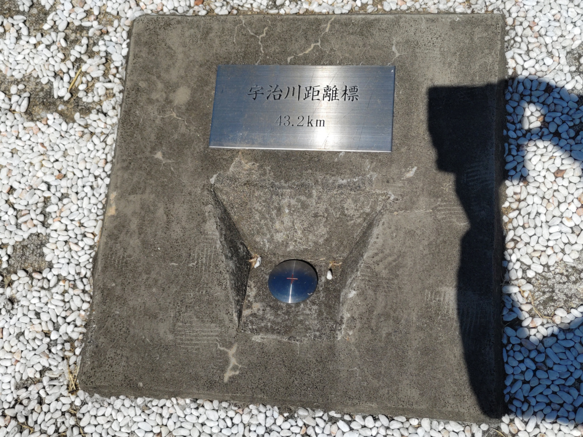 宇治川の土手には距離標が埋め込まれています。ここから大阪湾までは、ほぼ、マラトンとアテナイ間の距離ですね。