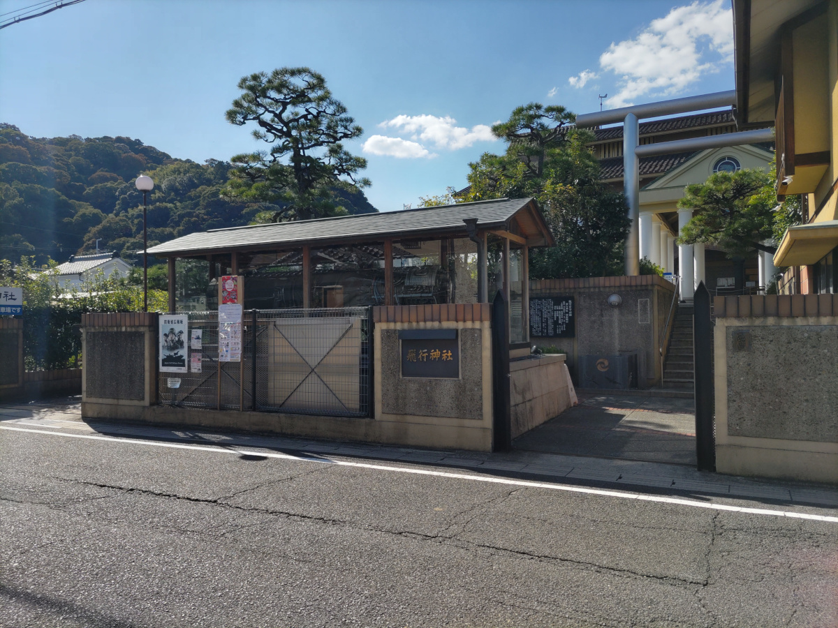 まずは、飛行神社です。日本で初めて動力飛行機を発明した二宮忠八が創建しました。境内には飛行機のエンジン(J79-GE/IHI/11A)等が展示されています。