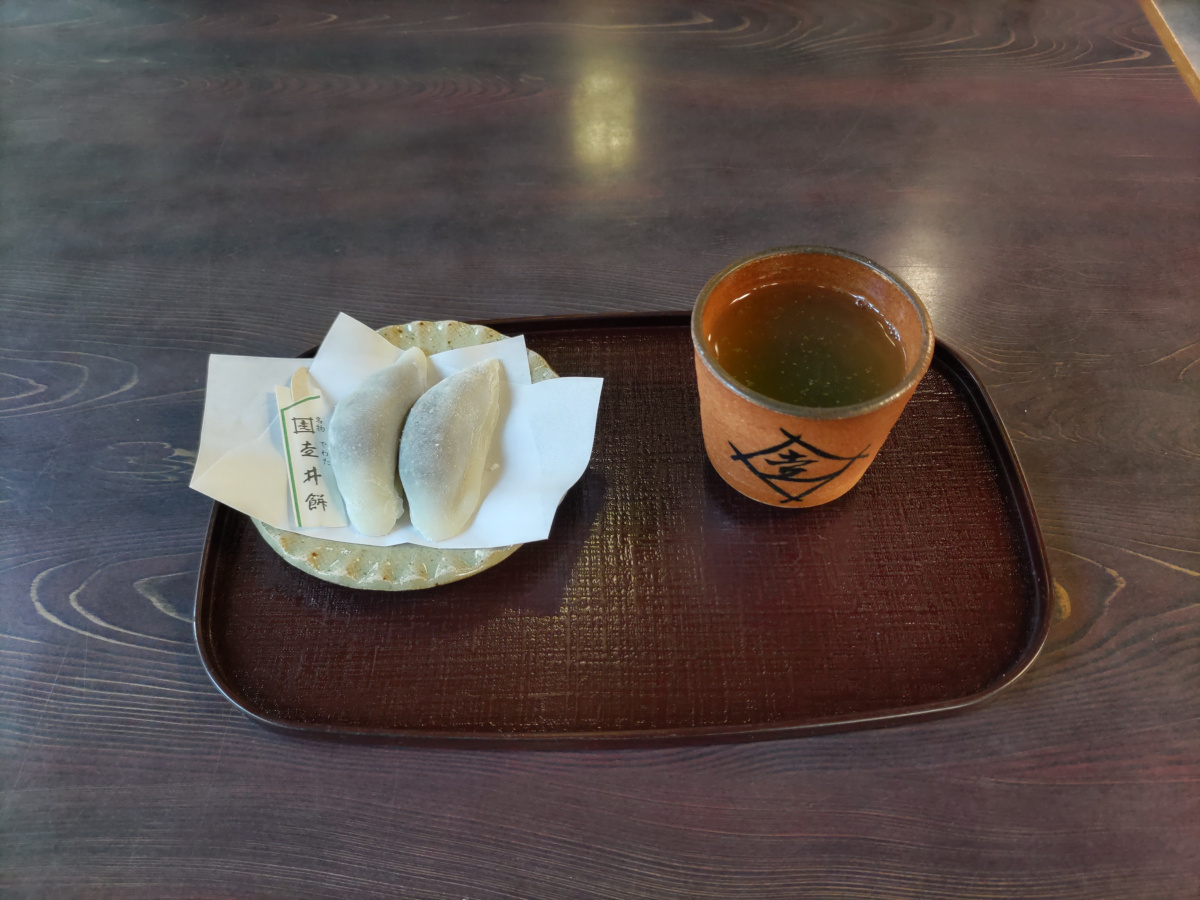 消費期限が2日であることと、街道歩きの最中に荷物を増やしたくないので、店頭で食べることにしました。お餅2つとお茶がついて、500円です。